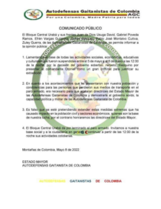 Aunque ninguna autoridad a confirmado la veracidad del documento, según un panfleto que se mantiene en redes sociales y que se le atribuye a las Autodefensas Gaitanistas de Colombia (AGC) “la población podrá retornar a la normalidad a partir de las 12:00 a.m de este lunes 9 de mayo, dando por culminado este “paro armado” que se realizó en represalia por la extradición de alias “Otoniel”.