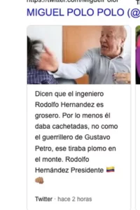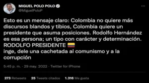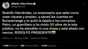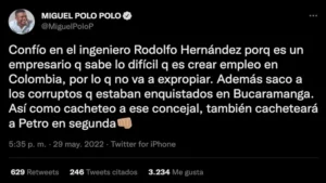Del mismo modo, el seguidor de la senadora María Fernanda Cabal expresó su total respaldo a la candidatura en segunda vuelta del ingeniero Rodolfo Hernández, quien recibió el apoyo de 5′953.209 colombianos. Lo primero que hizo Miguel Polo fue compartir una analogía de cachetadas y tiros con armas en el monte entre los dos candidatos a suceder a Iván Duque Márquez.