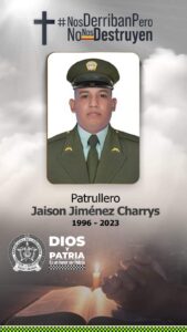 El patrullero Jaison Jiménez Charrys, de 27 años, fue la víctima del ataque tras el cual autoridades enviaron apoyo aéreo a la zona para ubicar a los responsables y brindar seguridad a los uniformados en tierra, pues en la zona hay fuerte presencia de la guerrilla del ELN y también actúa un reducto de ‘Los Pelusos’.