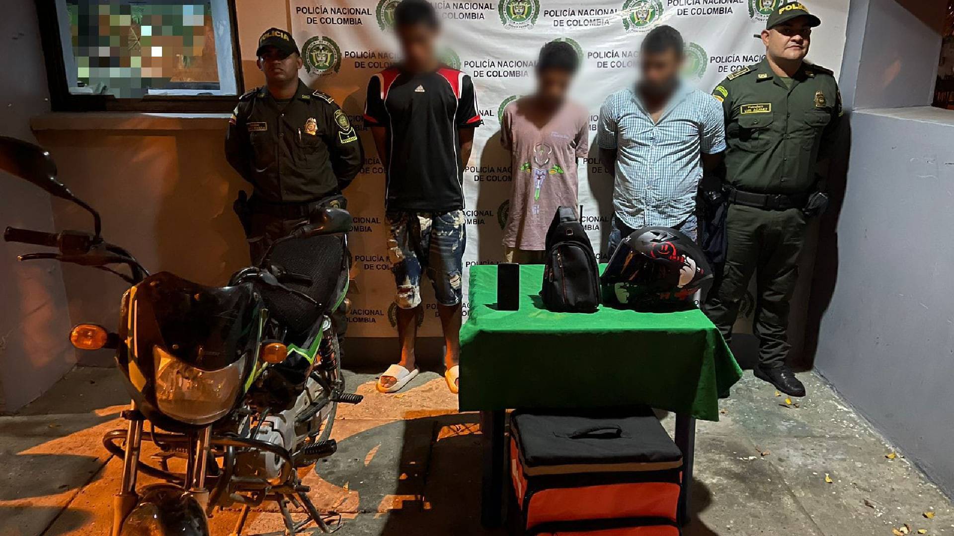 Los uniformados abordan la motocicleta para practicarles un registro a los tres ocupantes, encontrándoles en su poder los elementos hurtados de la víctima, inmediatamente se le materializan los derechos que le asisten como personas capturadas por el delito de Hurto, dejándoles a disposición de la Fiscalía General de la Nación, es de anotar que estas tres personas tienen 18 anotaciones judiciales por los delitos como Homicidio, Hurto Calificado, Fabricación, trafico, porte o tenencia de armas de fuego, accesorios partes o municiones, violencia intrafamiliar, daño en bien ajenos, tráfico o fabricación de estupefacientes y se encontraban con medida de detención domiciliaria.