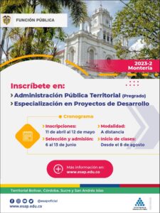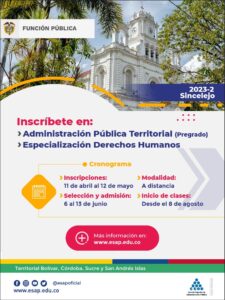 Hasta el 12 de mayo estarán abiertas las inscripciones para el pregrado en Administración Pública Territorial en Cartagena, Montería y Sincelejo, la Especialización en Proyectos de Desarrollo en Montería, la especialización en Derechos Humanos en Cartagena y Sincelejo, y la Maestría en