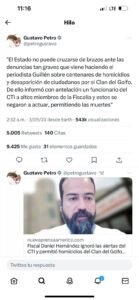 Esto tiene que ver con un trino del presidente Gustavo Petro publicado el 3 de mayo en el que señaló a Daniel Hernández de beneficiar a paramilitares, citando una publicación del periodista Gonzalo Guillén , en el que el mandatario dijo que el “Estado no puede quedarse cruzado de brazos”.