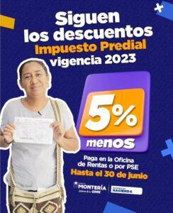 Además está el beneficio por pronto pago del 5% de descuento en el pago del Impuesto Predial Unificado, vigencia 2023, el cual hace parte de las estrategias implementadas por la Alcaldía para lograr la normalización de cartera.