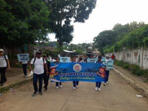 Profesores, personal administrativo y estudiantes de la Institución Educativa Julio C Miranda, realizan una protesta para rechazar los robos que inescrupulosos han cometido en el plantel educativo.