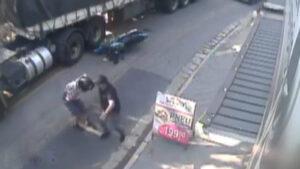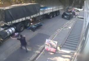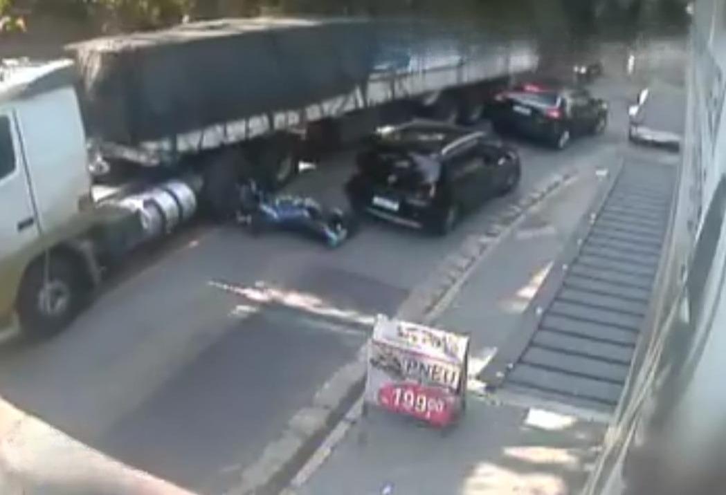 A través de redes sociales se ha hecho viral este video en el que se observa el dramático momento en que un motociclista chocó contra un automóvil por detrás y se cae en el carril donde circulaba un tractocamión.