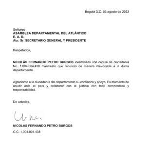 En el documento, enviado por correo electrónico directamente al presidente de la Asamblea del Atlántico, Welfran Mendoza, el hijo del presidente Gustavo Petro precisó lo siguiente: “renuncio de manera irrevocable a la duma departamental”.