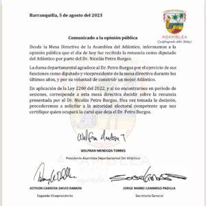 Así las cosas, la Mesa Directiva de la Asamblea del Atlántico deberá firmarla y aceptarla el próximo martes, siendo necesaria una consulta ante el CNE y la Registraduría Nacional para conocer qué nombre ocupará la curul que abandona Nicolás Petro, recordando que le fue otorgada por el estatuto de oposición al haber sacado la segunda mayor votación en las elecciones del año 2019 cuando aspiró a la Gobernación del Atlántico, siendo derrotado por Elsa Noguera.