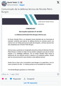 “Así las cosas, quedando en inmejorable situación jurídica de libertad el Doctor Petro Burgos, le deseo la mejor de las suertes cualquiera que sea el camino elegido o su estrategia defensiva. Por mi amigo Nicolás Petro tengo la esperanza de una solución pronta y efectiva a su problema jurídico, asunto que fue exclusivamente lo que interesó a esta defensa técnica” se lee en el comunicado.