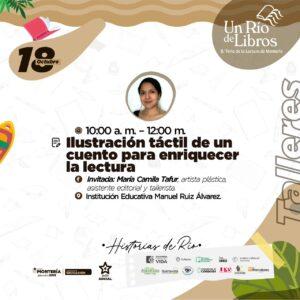 Con materiales táctiles de diferentes texturas, crearemos personajes que podrán ser vistos con las manos y con los ojos. Prepárate para aprender sobre ilustración táctil accesible a personas con discapacidad visual, a partir del cuento ¿Quién no ha besado a Teresa?, de la escritora monteriana Carmen Victoria Muñoz. Este taller es accesible a personas con y sin discapacidad visual. Dirige María Camila Tafur, artista plástica, asistente editorial y tallerista de la Fundación Tactus. Lugar: Institución Educativa Manuel Ruiz Álvarez.