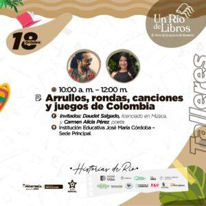 Los recuerdos de la infancia nos llegan a través de palabras, sonidos, imágenes, olores y momentos que alegran nuestros corazones. En la Colombia amplia, diversa y sorprendente se conservan tradiciones que de boca en boca van alimentando los sueños de los más pequeños y van fortaleciendo nuestras raíces culturales. Este libro, Arrullos, rondas, canciones y juegos de Colombia es una invitación a un viaje por las regiones de un país lleno de alegría y de colores a partir de una selección de arrullos, rondas, canciones y juegos. Serie ‘Leer es mi cuento’ del Mincultura. Dirigen Daudet Salgado, licenciado en Música, y Carmen Alicia Pérez, poeta. Lugar: Institución Educativa José María Córdoba – Sede Principal.