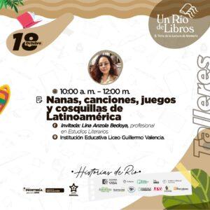 En este recorrido por distintos países de Latinoamérica, encontraremos una variada selección de las más representativas manifestaciones de la tradición oral que alimentan la formación de los más pequeños. El libro Nanas, canciones, juegos y cosquillas nos enseña la importancia y la necesidad del contacto de los niños con sus tradiciones y con quienes, de una forma u otra, les van contando las historias. La obra está llena de vida y color. Serie ‘Leer es mi cuento’ del Mincultura. Dirige Lina Anzola Bedoya, profesional en Estudios Literarios. Lugar: Institución Educativa Liceo Guillermo Valencia.