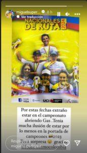 Y es que el Oriundo de Pesca, Boyacá, es el gran ausente de esta edición de lo Campeonatos Nacional de Ciclismo que se corre en Colombia. Por tal razón, en su Instagram, el ciclista escribió: “Por estas fechas extraño estar en el Campeonato abriendo gas. Tenía mucha ilusión de estar, por lo menos, en la portada de campeones 2023. Pero sorpresa, gracias Federación Colombiana de Ciclismo”, dijo.