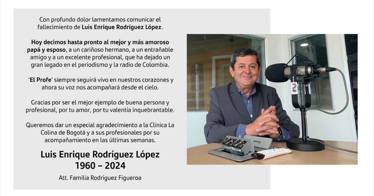 Con profundo dolor lamentamos comunicar el fallecimiento de Luis Enrique Rodríguez López. Hoy decimos hasta pronto al mejor y más amoroso papá y esposo, cariñoso hermano, entrañable amigo y excelente profesional, que deja un gran legado en el periodismo y la radio de Colombia. pic.twitter.com/XxO5OInN2H
