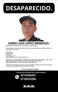La familia de López Mendoza expresó que cualquier persona que tenga algún tipo de información sobre su paradero, puede comunicarse a los siguientes números telefónicos: 3118523306 / 3213936437.