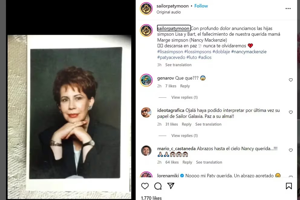 La triste noticia fue anunciada por Claudia Motta y Patricia Acevedo, quienes interpretan a Bart y Lisa Simpson en la versión en español de la serie. En sus redes sociales, las actrices expresaron su profundo dolor por la pérdida: “Con profundo dolor anunciamos las hijas Simpson, Lisa y Bart, el fallecimiento de nuestra querida mamá Marge Simpson (Nancy MacKenzie). Descansa en paz. Nunca te olvidaremos”.