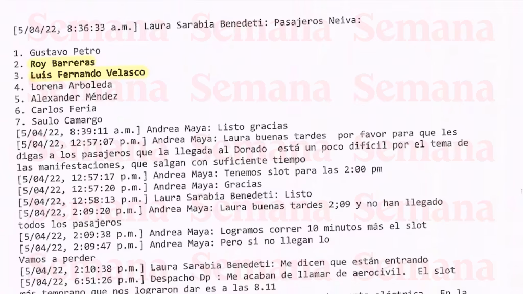 El avance de la investigación ha llevado a la Corte Suprema de Justicia a descubrir una prueba clave: 130 páginas de chats de un grupo llamado ‘Despachos avión campaña’. Los mensajes demuestran cómo los viajes, financiados por Sadi, fueron parte de los desplazamientos logísticos para la campaña presidencial de Gustavo Petro. Entre los implicados en la coordinación de estos vuelos se encuentran la actual canciller Laura Sarabia, el exjefe de despacho Armando Benedetti y la primera dama, Verónica Alcocer.