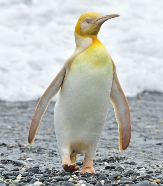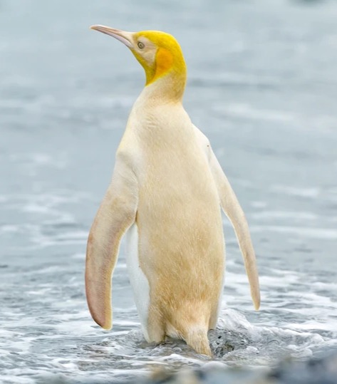 Un ejemplar de pingüino rey con plumaje amarillo fue fotografiado en la isla Georgia del Sur, generando asombro mundial. A diferencia de sus congéneres, sus plumas reflejan tonos blancos y dorados, un fenómeno causado por una rara condición genética llamada leucismo.