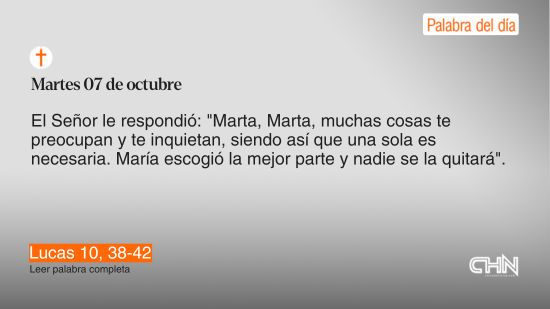 El Señor le respondió: “Marta, Marta, muchas cosas te preocupan y te inquietan, siendo así que una sola es necesaria. María escogió la mejor parte y nadie se la quitará”.