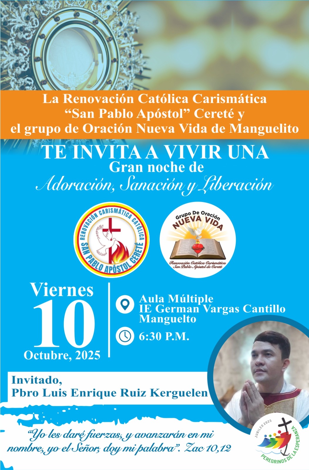 La ciudad de Cereté vivirá un encuentro espiritual único este viernes 10 de octubre, gracias a la organización de la Renovación Católica Carismática “San Pablo Apóstol” y el grupo de Oración Nueva Vida de Manguelito. La jornada, titulada “Gran noche de Adoración, Sanación y Liberación”, se realizará a partir de las 6:30 P.M. en el Aula Múltiple de la IE German Vargas Cantillo, en el corregimiento de Manguelito.