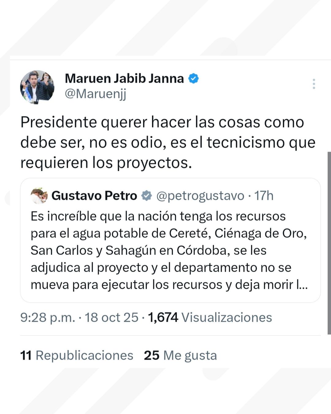 Jabib Janna defendió su gestión y calificó las afirmaciones del mandatario como acusaciones sin sustento técnico, recordando que los proyectos de acueducto en Cereté, Ciénaga de Oro, San Carlos y Sahagún están avanzando conforme a los procesos y normas que exige la ley.
