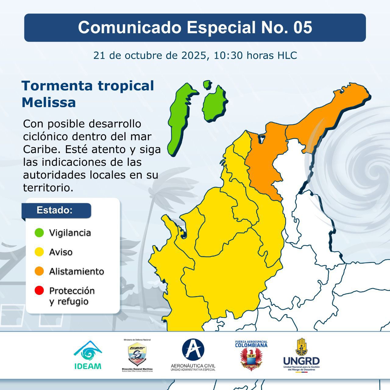 Ante el fortalecimiento del fenómeno, La Guajira y Magdalena se mantienen en estado de alistamiento, mientras que Atlántico, Bolívar, Sucre, Córdoba, Antioquia y Chocó (Golfo de Urabá) permanecen en estado de aviso. Asimismo, el archipiélago de San Andrés, Providencia y Santa Catalina, junto con las islas menores del norte del archipiélago, continúa en estado de vigilancia, dentro del Protocolo Nacional de Alerta por Ciclones Tropicales que sigue activo en todo el país.