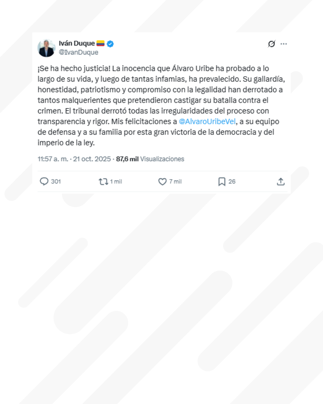 “La inocencia que Álvaro Uribe ha probado a lo largo de su vida, y luego de tantas infamias, ha prevalecido. Su gallardía, honestidad, patriotismo y compromiso con la legalidad han derrotado a tantos malquerientes que pretendieron castigar su batalla contra el crimen”, manifestó Duque.