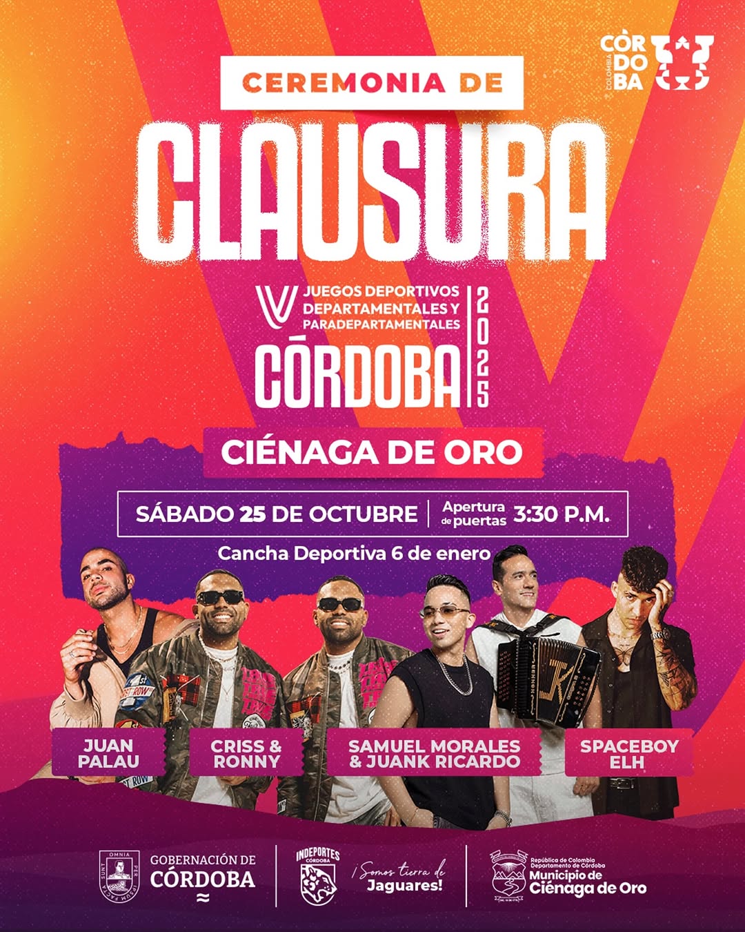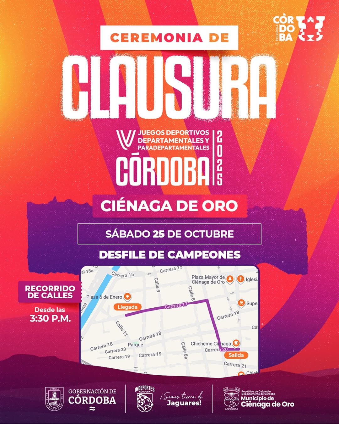 El municipio de Ciénaga de Oro será el epicentro de la gran clausura de los V Juegos Deportivos Departamentales y Paradepartamentales de Córdoba 2025, evento que se celebrará este sábado 25 de octubre con un colorido desfile y una jornada musical que promete encender la alegría de los cordobeses.