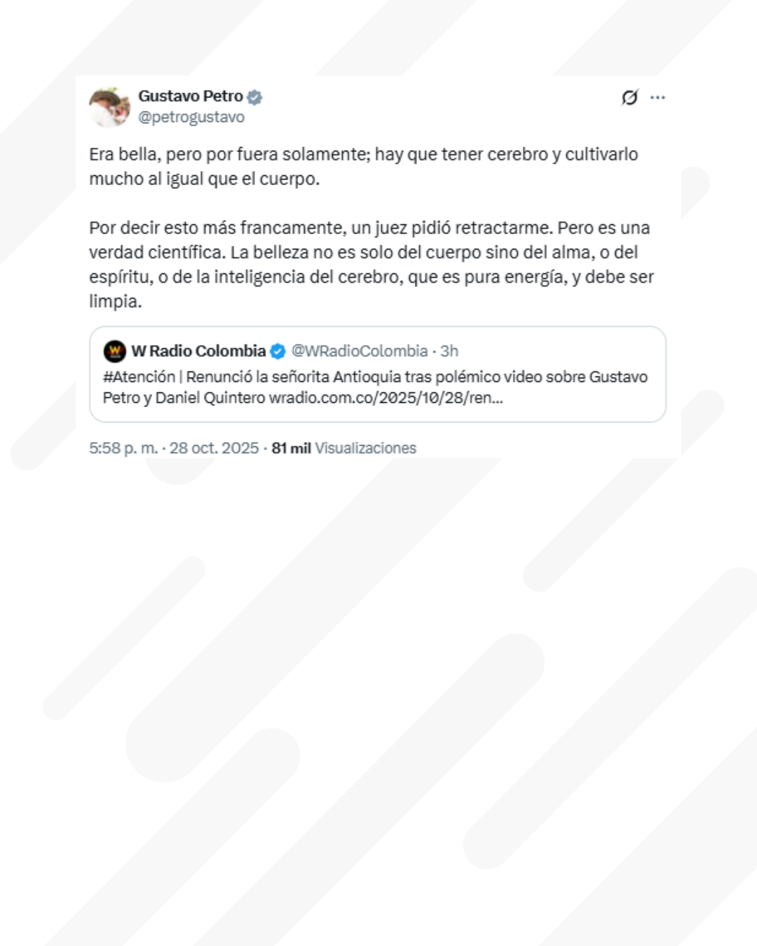 En su cuenta de X (antes Twitter), Petro señaló: “Era bella, pero por fuera solamente; hay que tener cerebro y cultivarlo mucho al igual que el cuerpo”. El mandatario agregó que, aunque un juez le pidió retractarse por comentarios previos, reafirmó su posición asegurando que la belleza “no es solo del cuerpo sino del alma, o del espíritu, o de la inteligencia del cerebro, que es pura energía y debe ser limpia”.