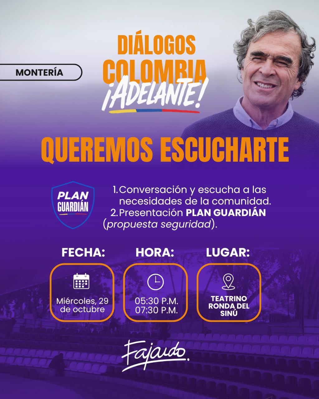 Durante su visita, Fajardo adelantará una agenda centrada en la presentación del Plan Guardián, su propuesta para fortalecer la seguridad ciudadana y empresarial, además de encuentros enfocados en promover la productividad, el trabajo digno y la salud como ejes de su programa de gobierno.