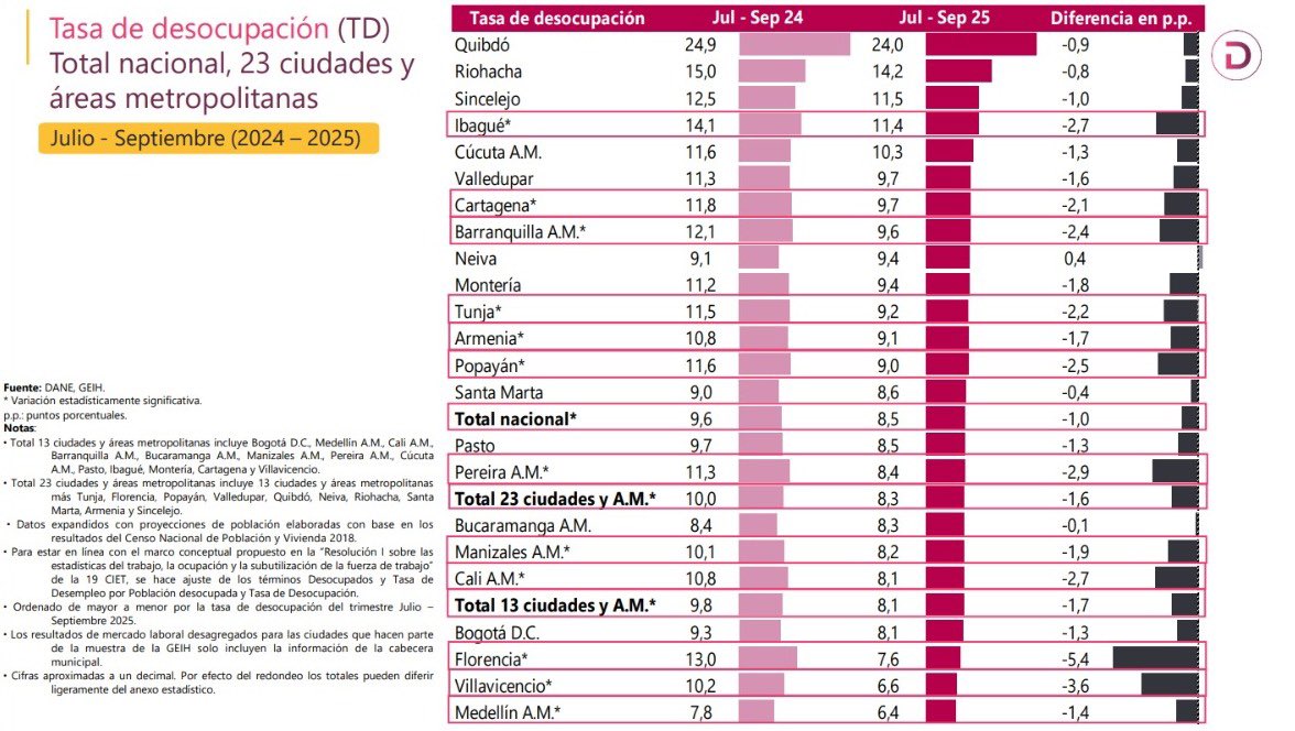 La ciudad de Montería registró una histórica disminución en su tasa de desempleo, que pasó del 11,2% al 9,4%, la más baja en siete años, informó el Dane. El descenso refleja un impulso económico generado por eventos recientes que dinamizaron el turismo, el comercio y los servicios, como el River City Global Forum y el Panamericano de Sóftbol, indicó el alcalde Hugo Kerguelén.