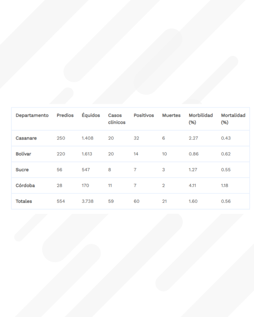 Durante 2025, la entidad recibió 159 notificaciones con signos compatibles con estas enfermedades. Tras los análisis de laboratorio, se confirmaron 42 casos de EEE en Sucre, Casanare, Córdoba, Bolívar, Magdalena y Meta, y 5 casos de EEV en Chocó, Bolívar, Córdoba y Magdalena. Los departamentos más afectados —Casanare, Bolívar, Sucre y Córdoba— presentan tasas de morbilidad entre 0,86% y 4,11%, y de mortalidad entre 0,43% y 1,18%.