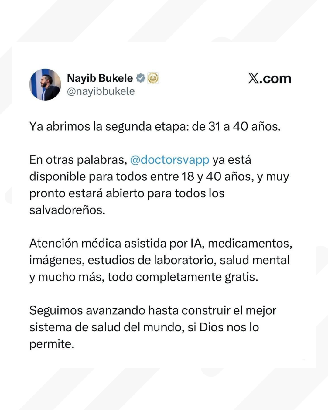 Bukele destacó que el proyecto es pionero a nivel global por su alcance y nivel de innovación. Asimismo, aclaró que su uso será totalmente opcional y no reemplazará la atención en hospitales ni clínicas, sino que funcionará como un complemento para fortalecer la capacidad del sistema público.
