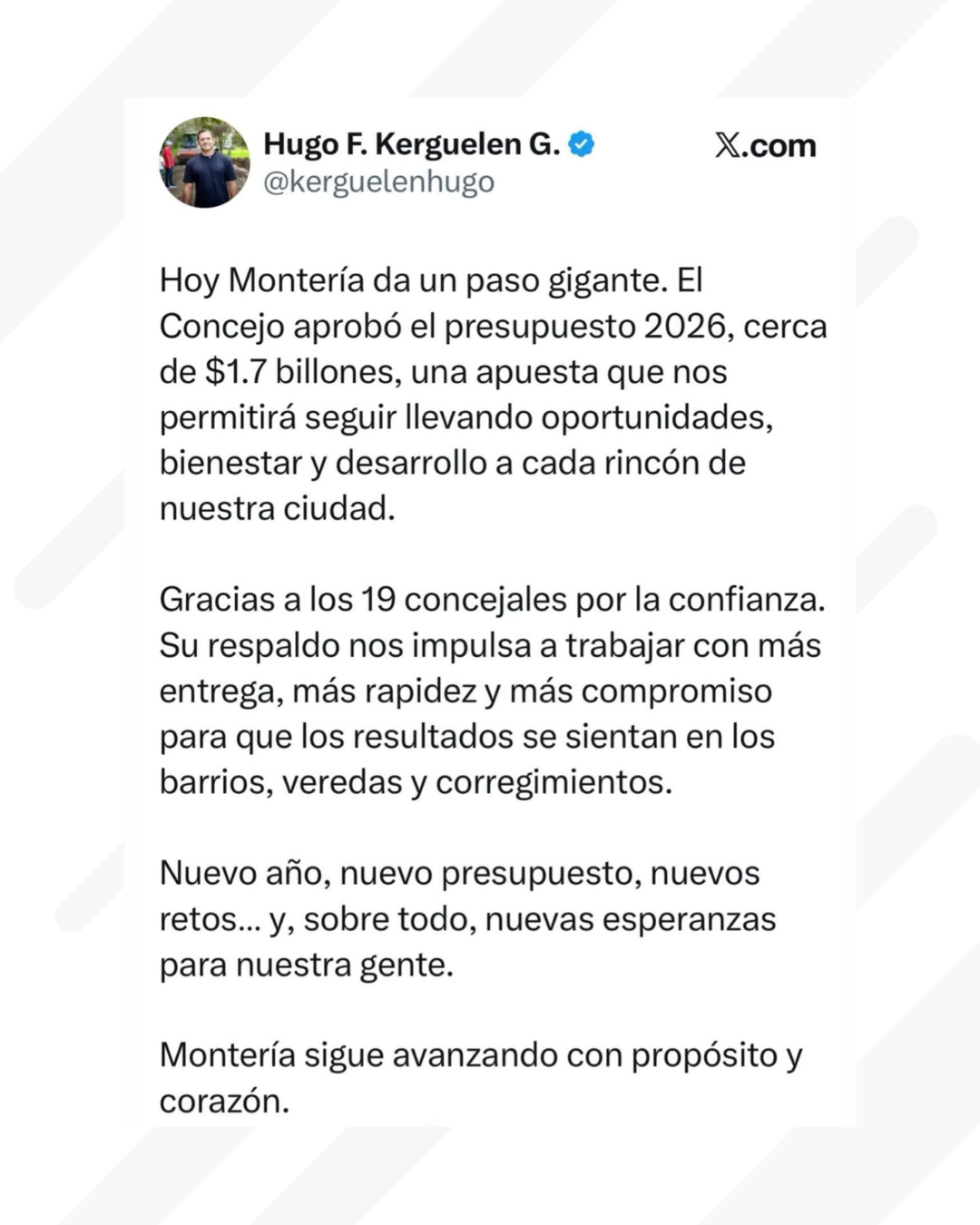 “Hoy Montería da un paso gigante. El Concejo aprobó el presupuesto 2026, cerca de $1.7 billones, una apuesta que nos permitirá seguir llevando oportunidades, bienestar y desarrollo a cada rincón de nuestra ciudad.”