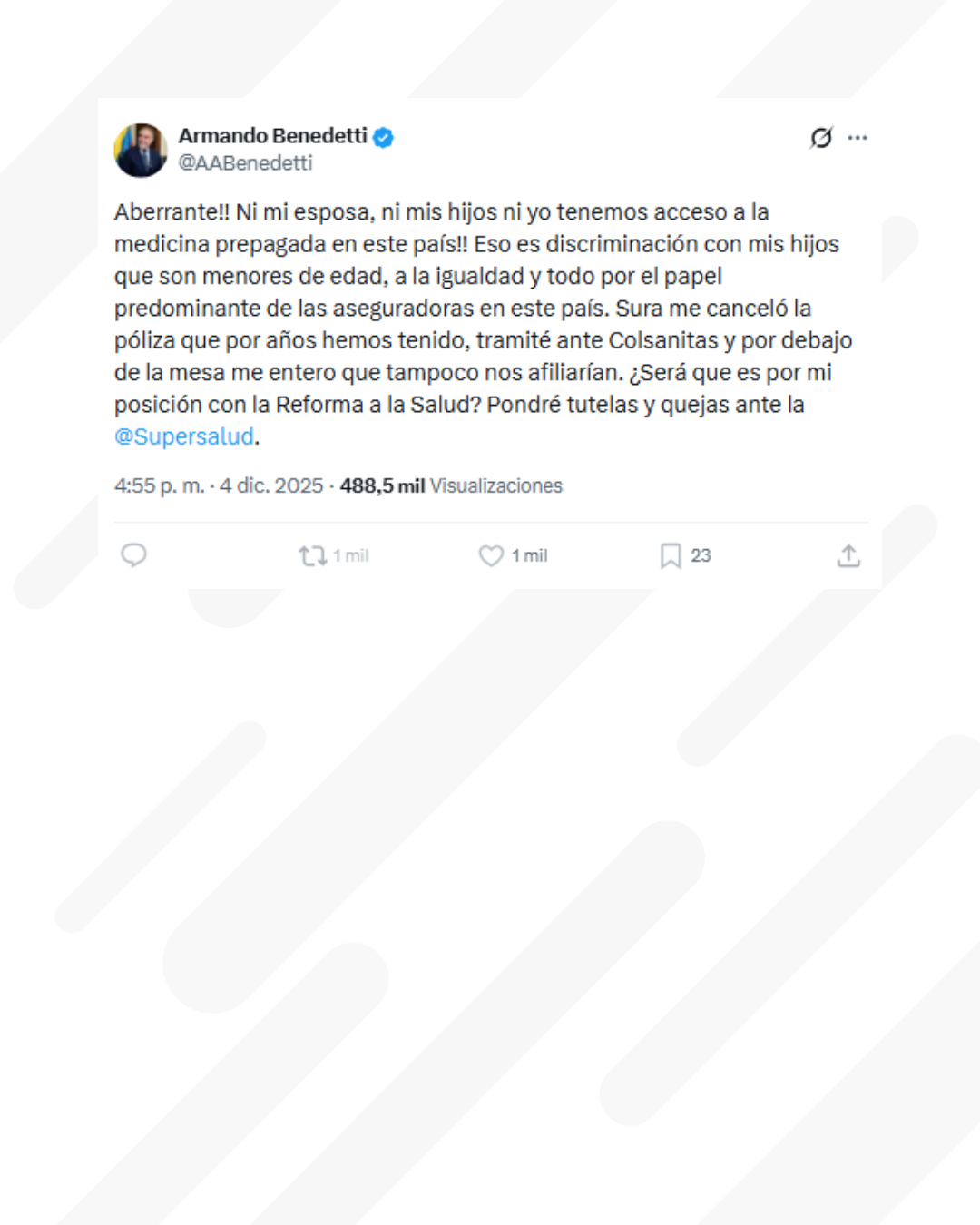 El ministro del Interior, Armando Benedetti, dio a conocer una denuncia pública tras afirmar que ni él, ni su esposa, ni sus hijos tienen acceso al servicio de medicina prepagada, pese a estar afiliados. Según explicó, incluso después de realizar los trámites correspondientes ante Colsanitas, la situación no tuvo solución.