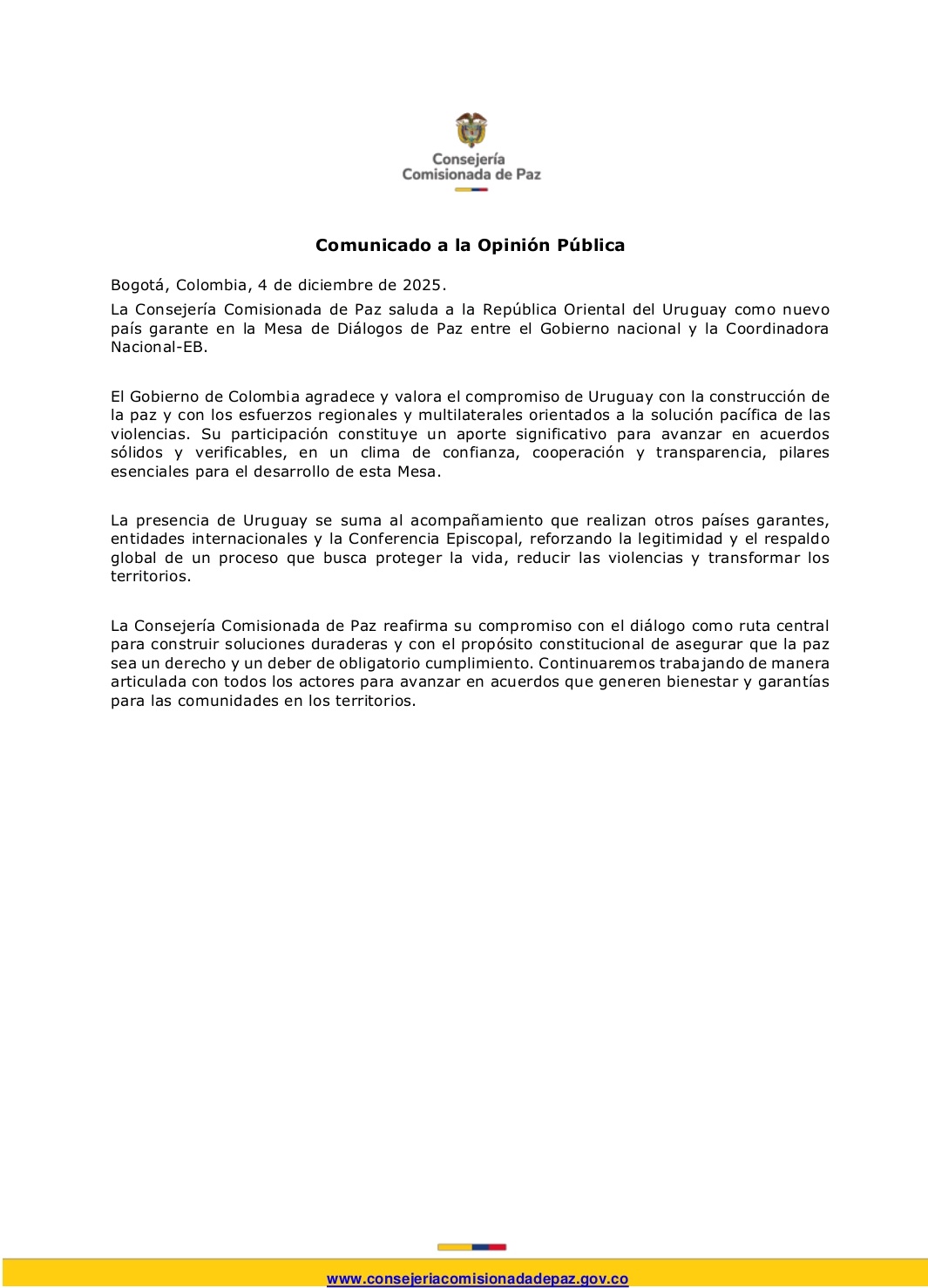 La Consejería Comisionada de Paz confirmó la adhesión del gobierno uruguayo y destacó que su presencia se convierte en un aporte clave para fortalecer la mesa de diálogos. En el comunicado oficial, la entidad resaltó el compromiso de Uruguay con las iniciativas regionales destinadas a la solución pacífica de los conflictos.