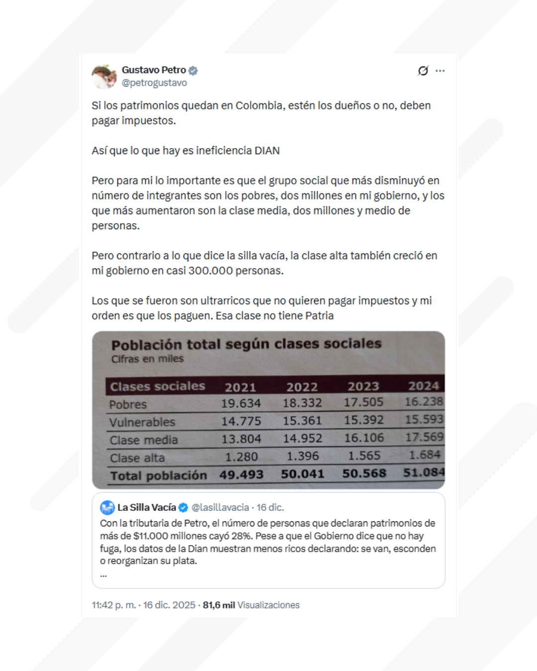A través de redes sociales, Petro volvió a referirse al tema y apuntó directamente a la Dirección de Impuestos y Aduanas Nacionales (Dian), a la que calificó de ineficiente si los grandes patrimonios —a los que denomina “ultrarricos”— permanecen en el país sin tributar de manera adecuada. En su mensaje, sostuvo que estas grandes fortunas concentran riqueza en Colombia, pero evaden su responsabilidad fiscal.