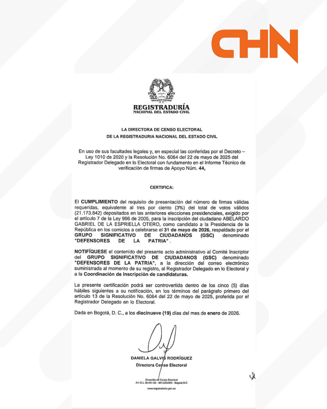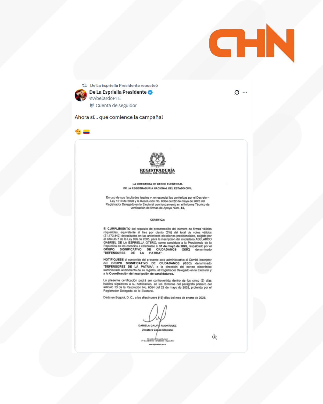 Con la validación oficial de sus firmas, Abelardo de la Espriella entra a la siguiente fase del proceso electoral fortalecido y con un capital político relevante, consolidando su presencia como uno de los aspirantes independientes con mayor músculo ciudadano y visibilidad en la carrera por la Presidencia de la República.