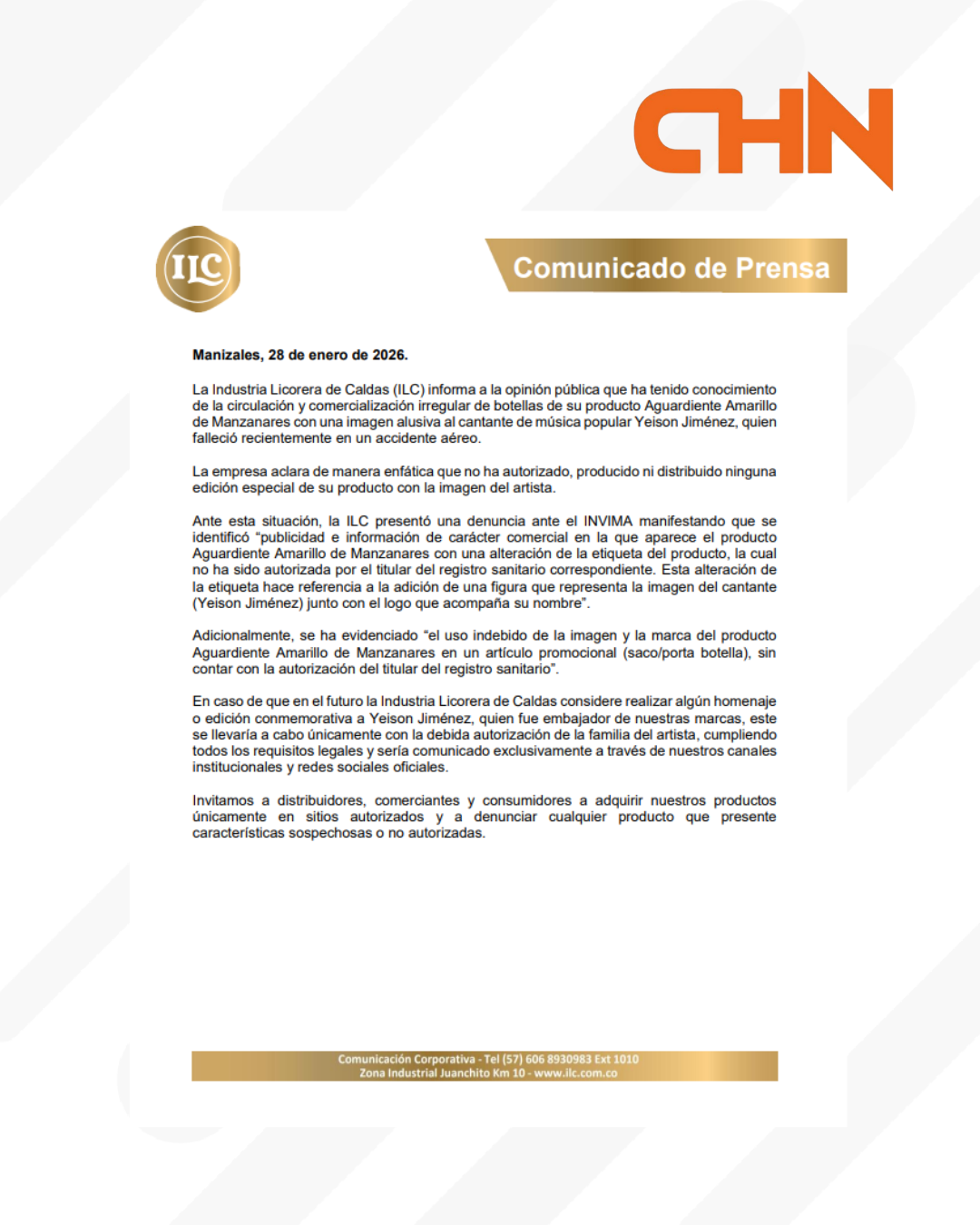 La Industria Licorera de Caldas (ILC) advirtió sobre la circulación de botellas de su producto Aguardiente Amarillo de Manzanares que presentan de manera irregular la imagen del cantante de música popular Yeison Jiménez, fallecido recientemente en un accidente aéreo.