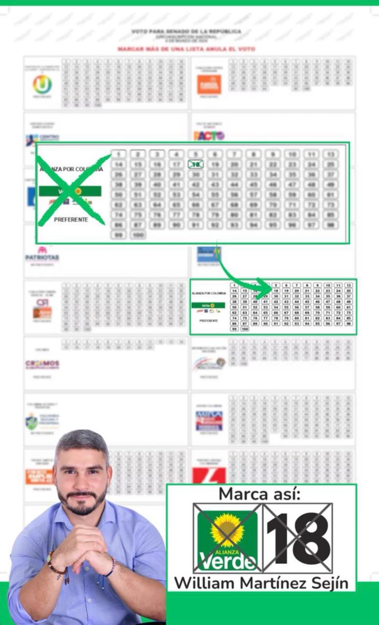 📌 William Martínez Sejin va con el número 18 en una lista al Senado que no es cualquier cosa. Se trata de una coalición nacional poderosa, integrada por Alianza Verde, En Marcha, Partido Demócrata, Colombia Renaciente y ASI, que ya inscribió oficialmente su artillería para la contienda legislativa.