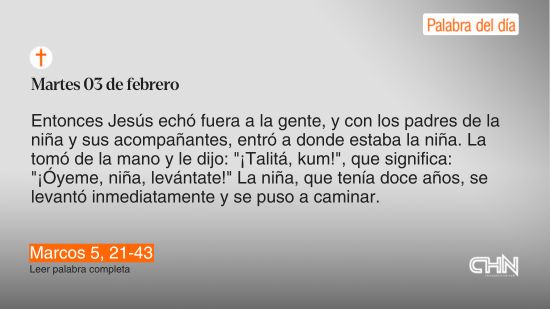 Entonces Jesús echó fuera a la gente, y con los padres de la niña y sus acompañantes, entró a donde estaba la niña. La tomó de la mano y le dijo: “¡Talitá, kum!”, que significa: “¡Óyeme, niña, levántate!” La niña, que tenía doce años, se levantó inmediatamente y se puso a caminar. Todos se quedaron asombrados. Jesús les ordenó severamente que no lo dijeran a nadie y les mandó que le dieran de comer a la niña.