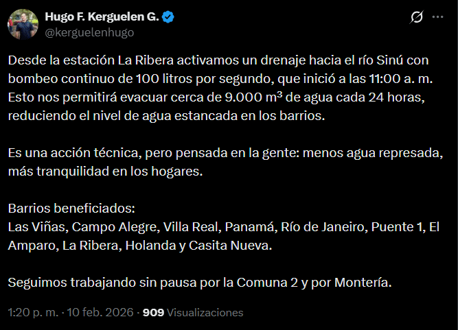 En el marco de las acciones técnicas para mitigar los efectos de las inundaciones en la margen izquierda, la Alcaldía de Montería puso en funcionamiento un sistema de drenaje desde la estación La Ribera hacia el río Sinú, con bombeo continuo de 100 litros por segundo, que inició operaciones a las 11:00 a. m., así lo dio a conocer el Alcalde de Montería, Hugo Kerguelén García.
