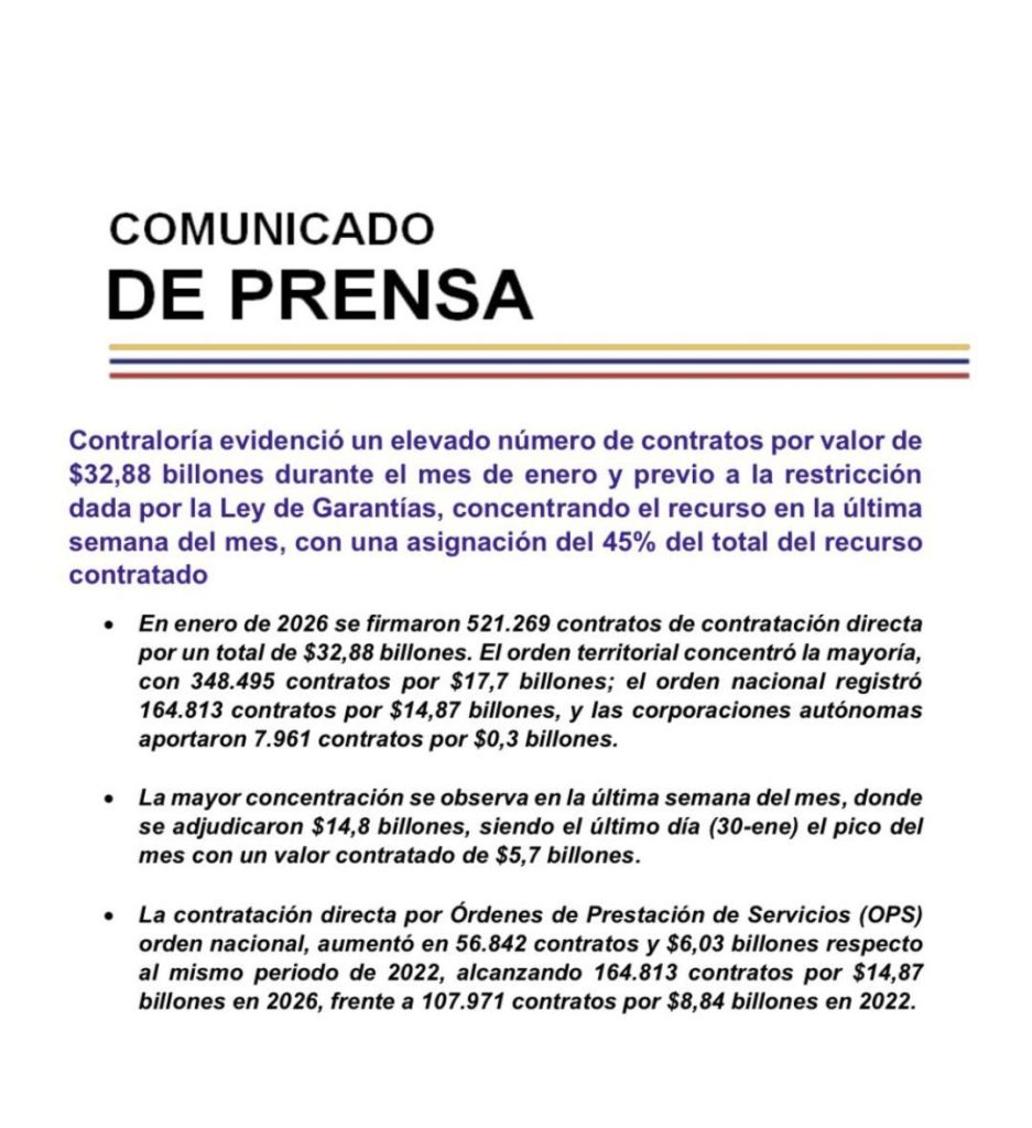 La Contraloría General de la República emitió una alerta por el alto volumen de contratación directa realizado por el Gobierno del presidente Gustavo Petro durante enero de 2026, justo antes de la entrada en vigencia de la Ley de Garantías. Según el ente de control, en ese mes se firmaron 521.269 contratos por un valor total de $32,88 billones.