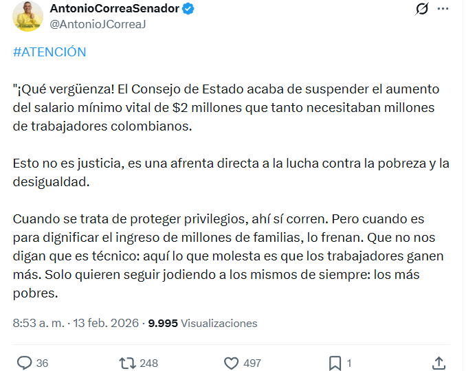 El senador Antonio Correa, conocido como “Toño” Correa, lanzó un fuerte pronunciamiento tras la decisión del Consejo de Estado de suspender el decreto que fijaba el salario mínimo vital en 2 millones de pesos para el pueblo colombiano.