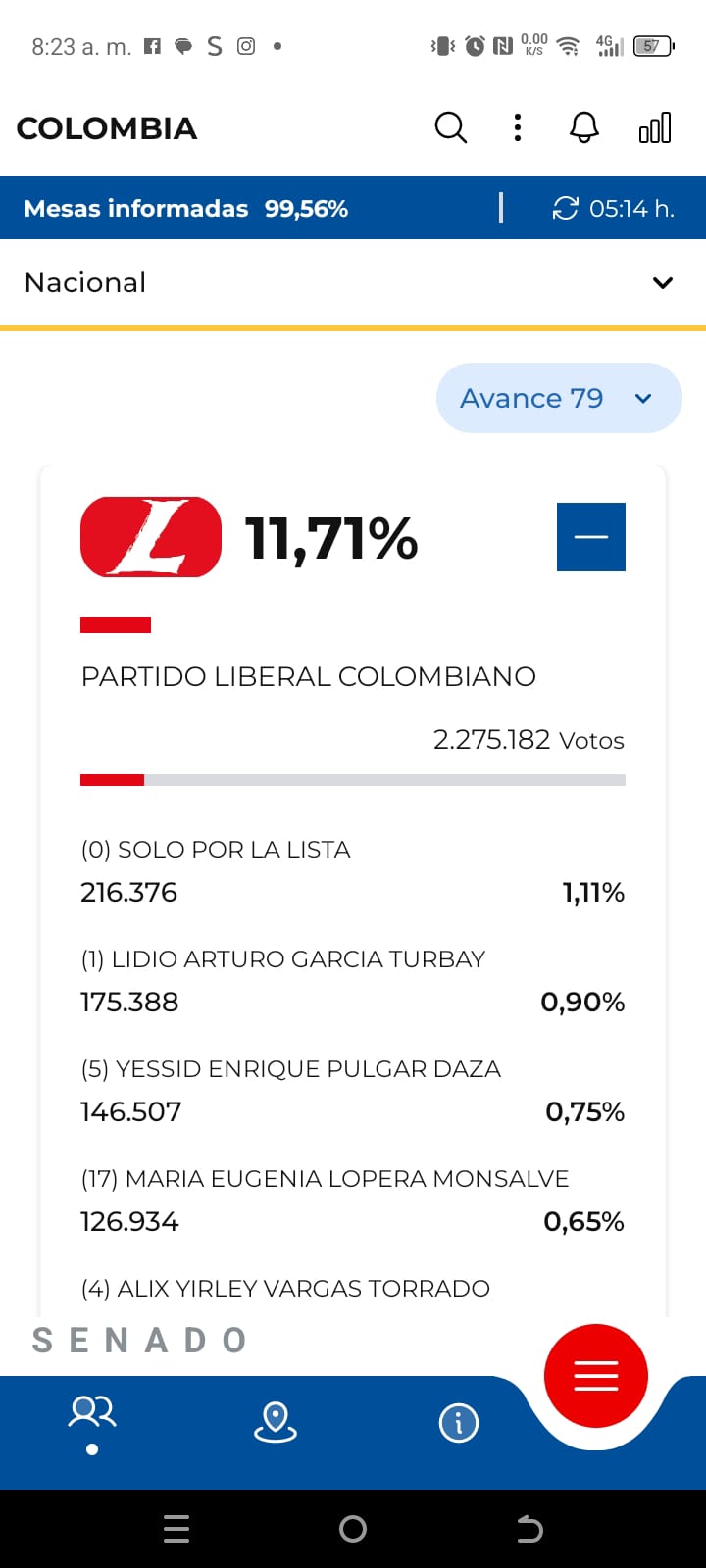 Con 175.388 votos, equivalentes al 0,90% del total de sufragios, Lidio García Turbay se consolida como el candidato liberal más respaldado en las elecciones al Senado, según el 99,56% de mesas informadas.