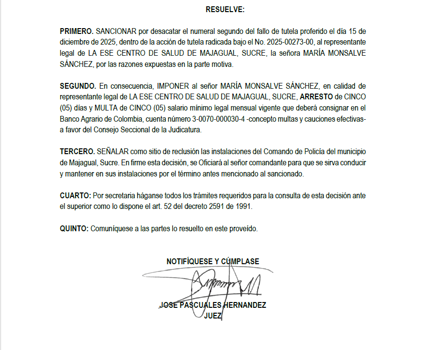 Sancionó a la gerente del centro de salud, María Monsalve Sánchez, con cinco días de arresto y una multa económica por desacatar la orden de tutela.
