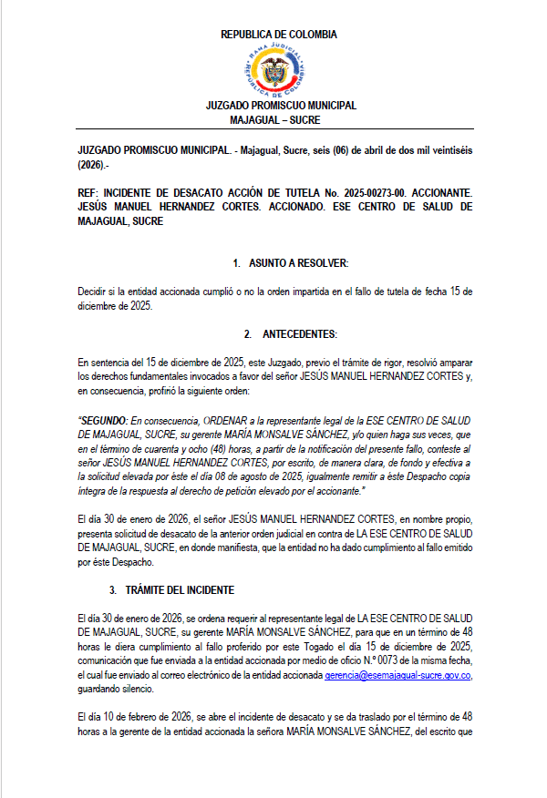Jesús Manuel Hernández Cortés acudió a la justicia buscando una respuesta clara a una petición que había hecho desde agosto de 2025. En diciembre, un juez le dio la razón y ordenó al centro de salud de Majagual responderle en un plazo de 48 horas.