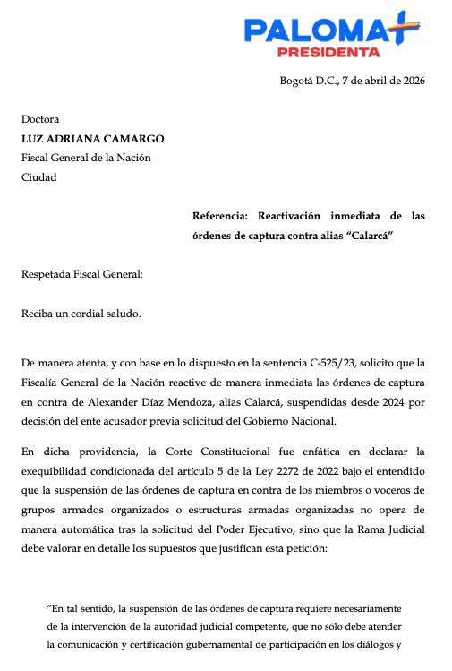 En un fuerte pronunciamiento, la candidata presidencial Paloma Valencia Laserna envió este martes una carta formal a la fiscal general Luz Adriana Camargo, exigiendo la reactivación inmediata de las órdenes de captura contra Alexander Díaz Mendoza, alias Calarcá, jefe negociador del Estado Mayor de los Bloques y Frente (EMBF). Esta medida había sido suspendida desde 2024 a solicitud del Gobierno Nacional.