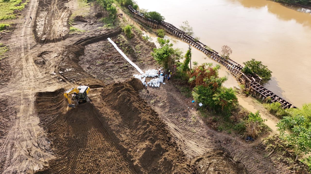 Al mismo tiempo, continúan los trabajos de construcción del dique como principal obra de mitigación, con apoyo de la Gobernación de Córdoba y la UNGRD, además de la llegada de maquinaria y material para reforzar la zona crítica.