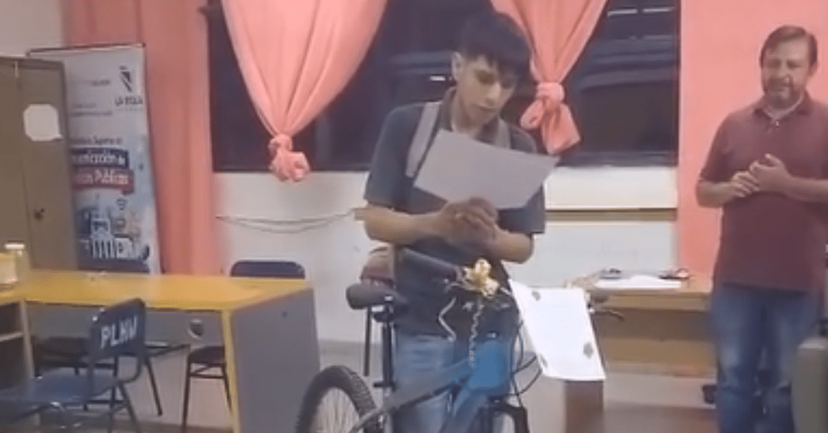 Detrás de ese instante hay una historia de disciplina que no pasó desapercibida. Para poder asistir a clases en el Instituto Esmeralda Fares de Aguilar, el joven debía recorrer diariamente 16 kilómetros en bicicleta desde su hogar en Pampa Chica hasta la ciudad de Chepes, enfrentando largas jornadas y múltiples dificultades.