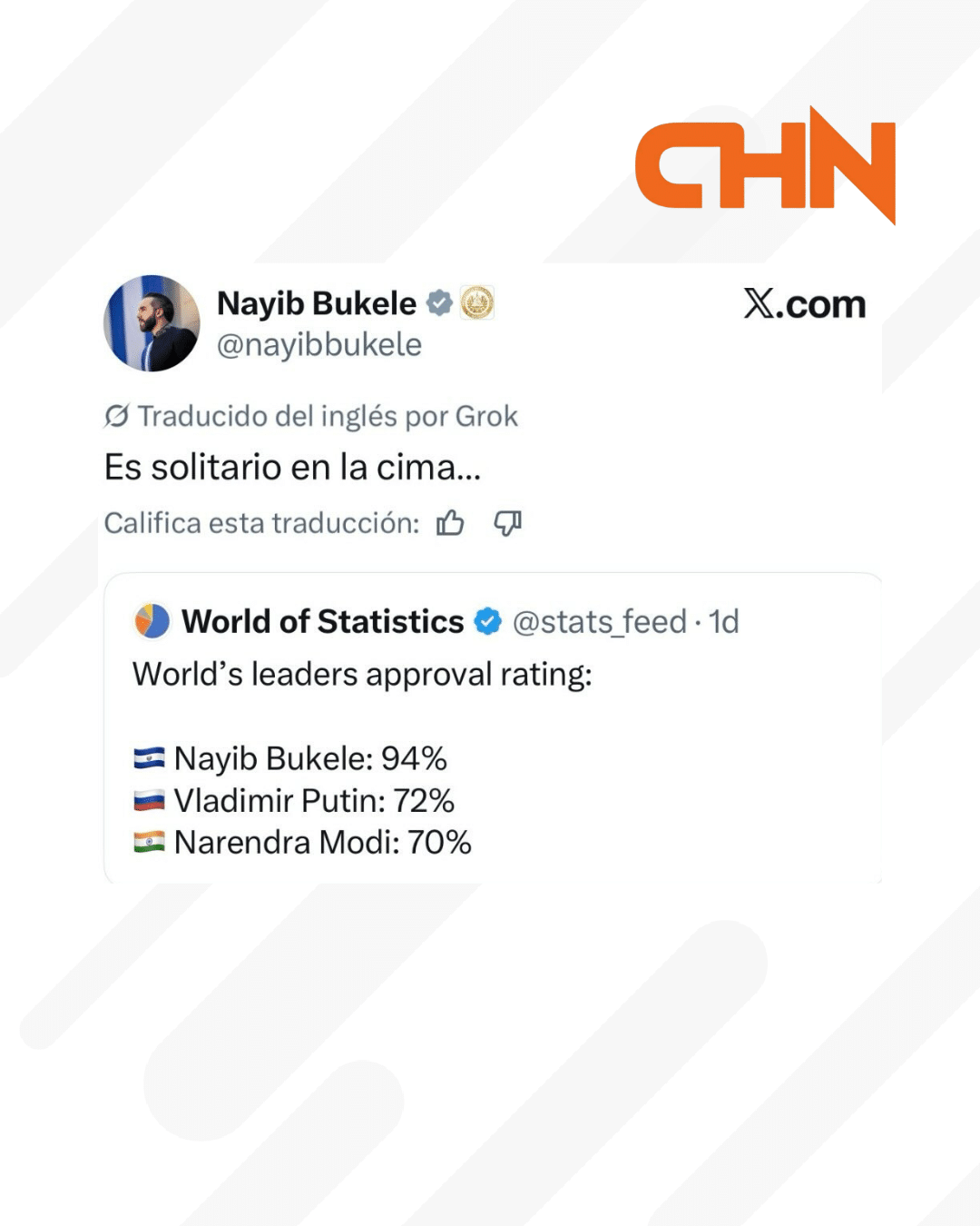 El respaldo no baja, al contrario, se dispara. Nayib Bukele vuelve a encabezar un ranking global que lo ubica como el presidente con mayor nivel de aprobación en el mundo, alcanzando un 94 % de apoyo ciudadano.